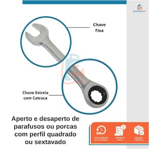 A Chave combinada com catraca é ideal para aperto e desaperto de parafusos ou porcas com perfil quadrado ou sextavado. Fabricado em aço carbono oferece durabilidade e resistência, para funcionamento adequado é necessário usar a chave de tamanho compatível com a cabeça da porca ou parafuso.