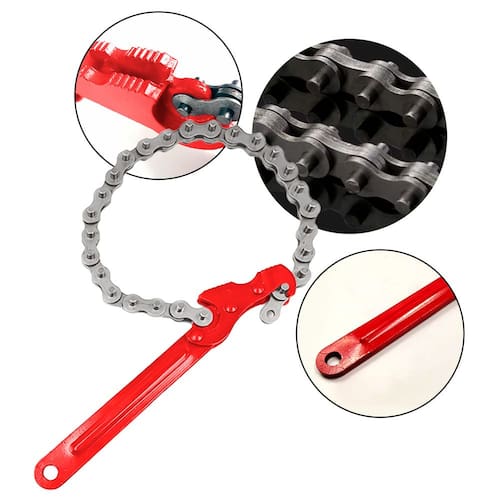 Tamanho: 8 polegadas Tipo: Manual, com corrente ajustável Material: Aço resistente Uso: Remoção de filtros, tubos e peças cilíndricas Aplicação: Profissional e doméstico