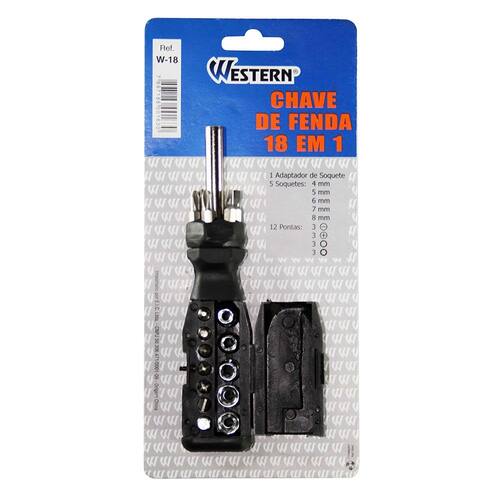 Chave de Fenda 18 em 1 Western WESTERN W-18 - Dimensão da peça: Adaptador 16,5 cm - Material: Aço e PVC - Porta pontas no próprio cabo - Contém 18 peças: 1 Adaptador de soquete / 5 Soquetes - 4 mm / 5 mm / 6 mm / 7 mm / 8 mm / 12 Pontas - 3 pontas fenda / 3 pontas philips / 3 pontas hexagonal allen / 3 pontas pozidriv - Cor: cabo preto Ean: 7897186001630