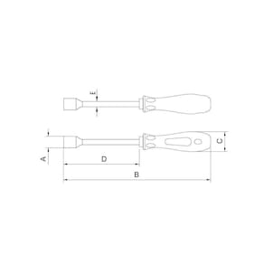 Haste em aço carbono. Soquete usinado em aço cromo vanádio. Acabamento cromado. Ponta fosfatizada. Cabo injetado. DIN 3125. As ferramentas são produzidas e testadas conforme normas específicas.