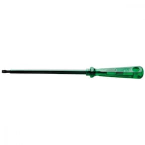 Haste em aço cromo vanádio temperada. Ponta fosfatizada.Cabo em PVC verde transparente.Isolação de 1000 V c. a.Produto em conformidade com a NBR9699 e NR10. DIN ISO 2380.As hastes das chaves de fenda são testadas em máquina de ensaio específica, para verificar o perfeito balanço entre resistência mecânica e dureza.Os dimensionais das pontas são verificados com gabaritos-padrão calibrados e certificados, e a qualidade do fosfato é inspecionada ao microscópio.As chaves de fenda isoladas são amplamente testadas, o que promove segurança na sua utilização em locais com tensões de até 1000 V c. a.Indicada para trabalhos em redes de tensão até 1.000 volts c. a.As ferramentas são produzidas e testadas conforme normas específicas.