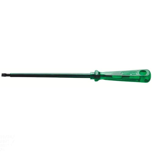 Chave de Fenda Isolada Ponta Chata em Aço Cromo Vanádio 3x200 mm 1/8x8 Tramontina PRO Tramontina - Seja em manutenções industriais ou automotivas, apertar ou afrouxar parafusos se torna mais fácil com a ajuda das Chaves Easygrip da Tramontina PRO. Seu cabo com formato sextavado proporciona maior conforto e agilidade na utilização. Estão disponíveis com ponta chata, cruzada, trafix, trafix PZ e canhão nos modelos tradicional, toco e com isolação. Escolha o tamanho ideal para o seu trabalho e mãos à obra. Orientações Haste em aço cromo vanádio temperada. /nponta fosfatizada./ncabo em PVC verde transparente./nisolação de 1000 V c. A./nproduto em conformidade com a NBR9699 e NR10. /ndin ISO 2380./nas hastes das chaves de fenda são testadas em máquina de ensaio específica, para verificar o perfeito balanço entre resistência mecânica e dureza./nos dimensionais das pontas são verificados com gabaritos-padrão calibrados e certificados, e a qualidade do fosfato é inspecionada ao microscópio./nas chaves de fenda isoladas são amplamente testadas, o que promove segurança na sua utilização em locais com tensões de até 1000 V c. A./nindicada para trabalhos em redes de tensão até 1.000 volts c. A./nas ferramentas são produzidas e testadas conforme normas específicas. Características Gerais EAN13 7891114105056 DUN14 17891114105053 NCM 8205.40.00 Peso Líquido 0,0440 kg. Peso Bruto 0,0480 kg. Metragem 0,000136 m. Dimensões Embalagem Compr. X Larg. X Alt. 295x 23x 20 mm. Dimensões Produto Compr. X Larg. X Alt. 299x 17x 17 mm. Cor 1 3C775F Hexa Dimensão Extra A 3,0 mm. Dimensão Extra B 299,0 mm. Dimensão Extra C 17,0 mm. Dimensão Extra D 200,0 mm. Dimensão Extra E 0,5 mm. Observações Sempre utilizar óculos de segurança para proteger os olhos./nutilizar luvas para proteger as mãos./nsempre utilizar chaves de fenda isoladas, identificadas pela marcação 1000V, quando é necessário trabalhar em um local que tenha corrente elétrica./nutilizar chaves com ponta adequada para cada tipo de fenda, para conseguir realizar a tarefa mais rápido e de forma segura./nrespeitar o torque estabelecido por norma para cada bitola./nnão usar as chaves de fenda como formão ou alavanca./nnão alterar as dimensões da ponta para obter outro perfil. Características Gerais do Produto: : 1 Ano