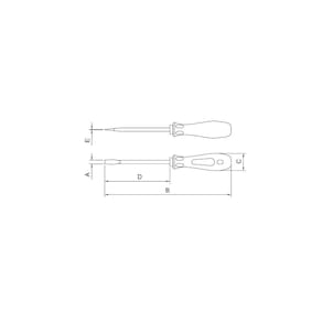 Haste em aço cromo vanádio temperada. Acabamento cromado. Ponta fosfatizada e magnetizada. Cabo injetado. DIN ISO 2380. Ponta chata. As hastes das chaves de fenda são testadas em máquina de ensaio específica, para verificar o perfeito balanço entre resistência mecânica e dureza. Os dimensionais das pontas são verificados com gabaritos-padrão calibrados e certificados, e a qualidade do fosfato é inspecionada ao microscópio. Apertar ou afrouxar parafusos de fenda simples. As ferramentas são produzidas e testadas conforme normas específicas.