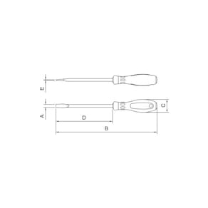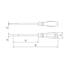 Haste em aço cromo vanádio temperada. Acabamento cromado. Ponta fosfatizada e magnetizada. Cabo com dupla injeção em PP e borracha. DIN ISO 2380. Ponta chata. As hastes das chaves de fenda são testadas em máquina de ensaio específica, para verificar o perfeito balanço entre resistência mecânica e dureza. Os dimensionais das pontas são verificados com gabaritos-padrão calibrados e certificados, e a qualidade do fosfato é inspecionada ao microscópio. Apertar ou afrouxar parafusos de fenda simples. As ferramentas são produzidas e testadas conforme normas específicas.