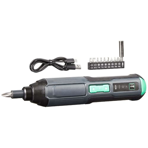 - Inclui uma chave de fenda elétrica de 4V, bateria de íon de lítio embutida de 2000mAh, cabo de carregamento USB-C e brocas de 9 peças e suporte de brocas de 1 peça