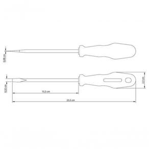 Modo de uso: ;Use óculos, luvas e outros equipamentos de proteção de acordo com a tarefa a ser executada. Utilize chaves de fenda isoladas, identificadas pela marcação V, quando for necessário trabalhar em locais com corrente elétrica. Importante: nestes casos, inspecione a integridade da isolação elétrica, e, se aparecerem trincas na isolação, suspenda o uso imediatamente. Utilize chaves com ponta adequada para cada tipo de fenda, para realizar a tarefa de forma mais rápida e segura. Respeite o torque estabelecido por norma para cada bitola. Não utilize as chaves de fenda como formão ou alavanca. Não altere as dimensões da ponta para obter outro perfil. Armazene em limpo e seco.