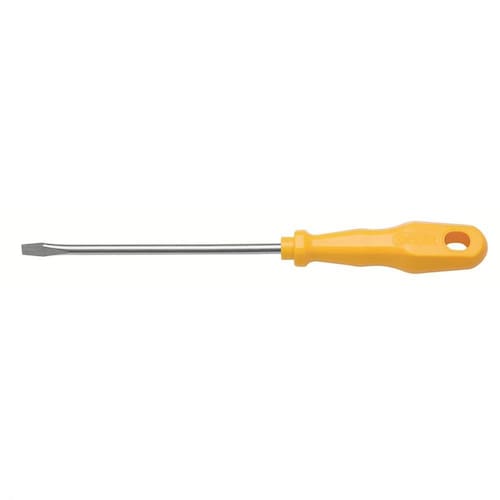 Os pequenos reparos em casa, ou mesmo no trabalho, vão ficar mais fáceis com a Chave de Fenda Tramontina Yellow com Ponta Chata 3/16x5 Polegadas. Ideal para remover ou fixar parafusos com precisão e firmeza, a ferramenta tem corpo em aço especial temperado com acabamento niquelado, o que garante alta resistência e durabilidade. Possui cabo em polipropileno injetado, que vai lhe garantir um manuseio firme e confortável. Sua caixa de ferramentas não pode ficar sem ela, aproveite hoje mesmo! Orientações Haste em aço especial temperado. Acabamento niquelado. Ponta chata. As hastes as chaves de fenda são testadas em máquinas de ensaio específicas, para verificar o perfeito balanço entre resistência mecânica e dureza. Cabos injetados com material de alta resistência. Os dimensionais das pontas são verificados com gabaritos-padrão, calibrados e certificados. As ferramentas são produzidas e testadas conforme normas específicas. Características Gerais EAN13 7891114010909 DUN14 17891114010906 NCM 8205.40.00 Peso Líquido 0,0450 kg. Peso Bruto 0,0450 kg. Metragem 0,000165 m³. Dimensões Embalagem (Compr. X Larg. X Alt.) 220x 30x 25 mm. Dimensões Produto (Compr. X Larg. X Alt.) 215x 26x 26 mm. Cor 1 FFD200 Hexa Dimensão Extra A 5,5 mm. Dimensão Extra B 215,0 mm. Dimensão Extra C 25,7 mm. Dimensão Extra D 125,0 mm. Dimensão Extra E 1,3 mm. Observações Use óculos, luvas e outros equipamentos de proteção de acordo com a tarefa a ser executada. Utilize chaves de fenda isoladas, identificadas pela marcação 1.000 V, quando for necessário trabalhar em locais com corrente elétrica. Importante: nestes casos, inspecione a integridade da isolação elétrica, e, se aparecerem trincas na isolação, suspenda o uso imediatamente. Utilize chaves com ponta adequada para cada tipo de fenda, para realizar a tarefa de forma mais rápida e segura. Respeite o torque estabelecido por norma para cada bitola. Não utilize as chaves de fenda como formão ou alavanca. Não altere as dimensões originais da ponta para obter outro perfil. Armazene em local limpo e seco.