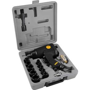 Conteúdo da embalagem: 1 Chave de impacto. Acompanha: 1 maleta plástica, 10 soquetes em aço cromo vanádio com encaixe de 1/2 (9 mm, 10 mm, 11 mm, 13 mm, 14 mm, 17 mm, 19 mm, 22 mm, 24 mm e 27 mm), 1 extensão 5 com encaixe de 1/2, 1 minilubrificador, 1 conector de engate rápido macho e 1 chave allen.