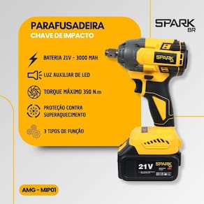 Destaques do Produto: • Alta Potência 21V: Ideal para serviços pesados com até 350N·m de torque máximo • Velocidade e Impacto: Até 2500 RPM e 3000 impactos por minuto • Função martelo • Compacta e Ergonômica: Design leve (1,3 kg sem bateria) com pegada firme e confortável • Bateria de Íons de Lítio: Recarregável com indicador de carga e proteção contra sobrecarga • Luz de Trabalho LED: Ilumina áreas escuras para mais precisão • Sentido de rotação ajustável: Frente, ré e trava de segurança central • Aperto Rápido de Soquetes: Sistema simples e eficiente com eixo de saída 1/2" (12,7 mm) ________________________________________ Especificações Técnicas: • Modelo: AMG-MIP01 • Tensão da Bateria: 21V • Velocidade sem carga: 0–2500 RPM • Impactos por minuto: até 3000 IPM • Torque máximo: 350 N·m • Eixo de saída: 1/2" (12,7 mm) • Peso (sem bateria): 1,3 kg • Faixa de temperatura de uso: 5°C a 40°C • Entrada do carregador: Bivolt • Sistema de ventilação e resfriamento automático • Proteção contra superaquecimento e sobrecarga ________________________________________ Itens Inclusos: • 1x Parafusadeira/Chave de Impacto Spark BR • 1x Bateria de íons de lítio 21V - 3000 mAh • 1x Maleta para transporte • 1x Carregador bivolt • 1x Manual de instruções • 4 Chaves de impacto (17mm, 19mm, 21mm, 22mm) • Adaptador para Parafusadeira ________________________________________ Indicado para: • Instalações de móveis • Reparos automotivos • Manutenção residencial e industrial • Montagem de estruturas metálicas e painéis • Parafusamento e desaperto de porcas, parafusos e rebites ________________________________________ Dica: Sempre use equipamentos de proteção (óculos, luvas) durante o uso. A ferramenta é segura, mas potente!
