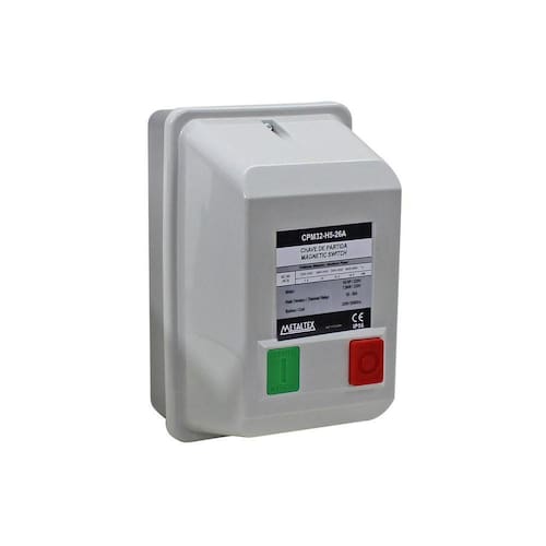 Chave de partida direta trifásica para manobras e proteção de motores em caixas termoplásticas. Robusta caixa com base metálica. Grau de proteção IP56.Aplicações: Sistemas de Irrigação e Bombeamento, Indústrias, Edifícios, Ventiladores e Exaustores, Máquinas e Equipamentos, Piscinas.Características Técnicas:Potência: 10CVAlimentação: 220VCAFaixa de Ajuste: 22 -32APotência Máxima: 15KwComposição: Contator + Relé de sobrecargaREF: CPM32-H5-26ASKU: 1500 Ean: 7899112756973