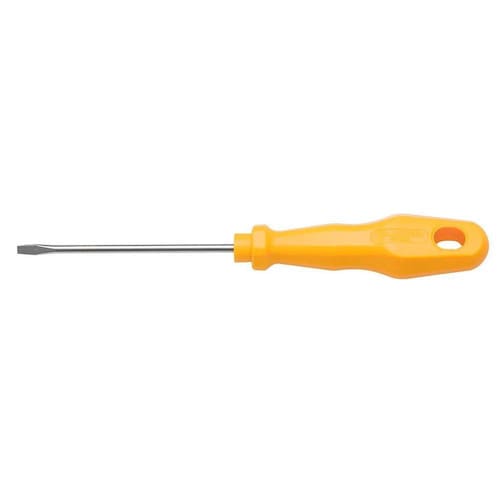 A cor amarela vibrante não só adiciona um toque de estilo, mas também facilita a identificação da ferramenta em um ambiente de trabalho movimentado. A haste em aço especial temperado é meticulosamente projetada para resistir às mais severas condições, enquanto o acabamento niquelado não apenas confere uma aparência profissional, mas também protege a chave de fenda contra corrosão e desgaste prematuro.