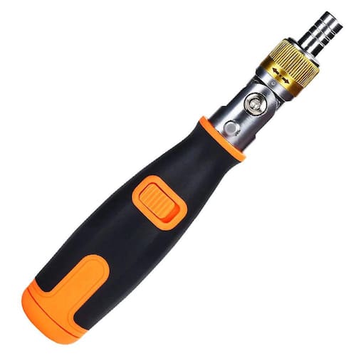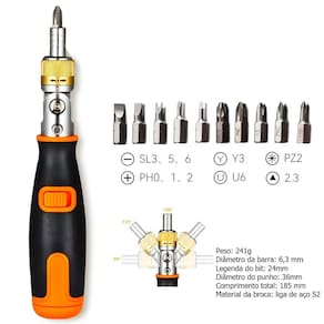 Chave Multifuncional Com 10 Bits Com Ajuste de ÂnguloChave de fenda portátil 10 em 1: Este conjunto de chave de fendainclui 10 Bits diferentes, tornando-se uma ferramenta versátil,permitindo o armazenamento e o transporte fáceis.Multi angular Capaz: A chave de fenda pode ser ajustada paradiferentes ângulos, facilitando o alcance de espaços e cantosapertados. Tipo da cabeça do parafuso do triângulo: O tipo dacabeça do parafuso do triângulo assegura um aperto seguro noparafuso, impedindo que deslize ou caia para fora.Especificação:Material do produto: Cromo vanádio vanádioProduto Tipo: Ratchet chaveAjuste de ângulo: 90° x 135° x 180°Tamanho: 185 × 30 × 30mmMadeidas:Fenda: 3.0 x 5.0 x 6.0Philips: PH0 x PH1 x PH2Fenda U: U6Triângulo: TA2.3Itens inclusos:1. (Um) Chave Multifuncional Com 10 Bits.