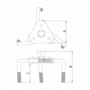 Ref.: 44096501. Marca: Tramontina. Corpo e garras em aço especial cromados. Garras temperadas. Quadrado de encaixe interno de 3/8 pol. em aço cromo molibdênio e temperado. Adaptador com quadrado de encaixe interno 1/2 pol. ou sextavado externo 21 mm em aço cromo vanádio, temperado e com acabamento cromado. Utilizada para remover filtro de óleo de caminhões e carros. É necessário utilizar um acessório (catraca, cabo T ou soquete) juntamente com a chave para filtro de óleo para realizar a remoção do filtro. As ferramentas são produzidas e testadas conforme normas específicas. Medidas (Vide imagem do anúncio): A: 63,5mm. B: 95mm. C: 54,5mm.