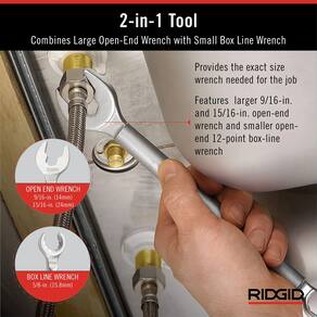 RIDGID Chave 2 em 1 27023 Modelo 2002 One Stop para paradas angulares, paradas retas e acoplamentos de compressão - Chave de parada única: fornece o tamanho exato da chave necessária para instalar paradas angulares, batentes retos, acoplamentos de compressão, tornando-a perfeita para trabalhar com linhas de suprimento e válvulas de corte - Ferramenta 2 em 1: possui 15/40.6 cm. chave de boca aberta, 9/40.6 cm. chave de ponta aberta e uma chave de linha de caixa de 12 pontos aberta em uma ferramenta para tornar o encanamento rápido e fácil - Fixação e aperto eficientes: a chave menor permite que você segure as porcas em duas vezes mais posições enquanto a chave maior aperta as porcas de compressão - Design compacto: permite que você armazene convenientemente a chave menor dentro do corpo tubular da chave maior e simplesmente desparafuse para removê-la quando for hora de usar - Multiuso: ideal para uma variedade de outras tarefas de instalação, incluindo pernas de eletrodomésticos, chuveiros, porcas de torneira e vasos sanitários