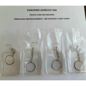 Chaveiro acrílico para imagem 3x4 para personalizar pacote com 100 unidades.Os chaveiros são embalados individualmente : um chaveiro e uma tampa.Fabricado com poliestireno cristal virgem.Dimensão do chaveiro : Comprimento = 6 cm e Largura = 4cmDimensão da arte : Comprimento = 4 cm e Largura = 3 cmCor : TransparenteNão acompanha a arteMontado com a corrente e argola Marca: Jax brindes