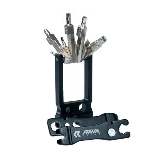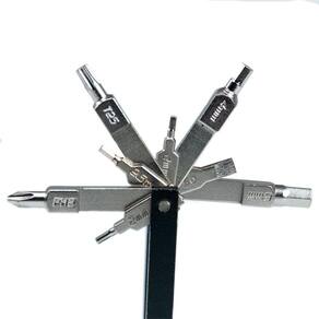 - Chave de rosca 5, 8(2x) e 10 mm - Chave de raio(3x) - Chave de raio Mavic (2x) - Chave de corrente - Allen 2(2x), 2.5, 4, 5, 6 e 8 mm - T25 | PH2 - Fenda 5 mm - Chave de corrente