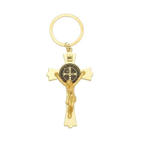 Chaveiro em formato de Crucifixo com Medalha de São Bento nas cores prata e dourado.