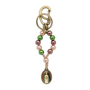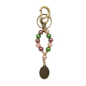 Feito com delicadas pérolas coloridas, metais comuns em ouro velho, cordão e resina, sendo que o chaveiro tem aproximadamente 12 cm de comprimento.
