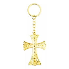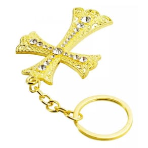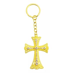 Chaveiro com enfeite no formato de um crucifixo dourado de 7 cm de dimensão. Material: metal