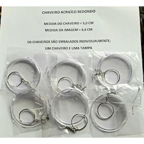 Chaveiro de acrílico redondo para personalizar . Pacote com 100 unidades , os chaveiros são embalados individualmente , um chaveiro e uma tampa . Fabricado com poliestireno cristal virgem .Montagem do chaveiro : encaixar as 2 imagens e pressionar a tampa.Dimensão do chaveiro : 5,0 cmDimensão da arte : 4,4 cm Cor : transparenteNão acompanha a arte Marca: Jax brindes