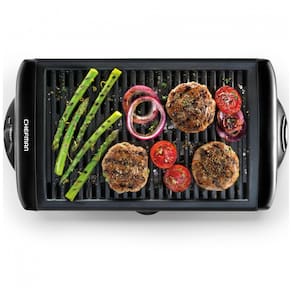 Churrasqueira grill elétrica com capacidade para até 6 porções, chapa antiaderente, controle de temperatura e bandeja de água para redução de fumaça. Possui alças de toque frio e proteção contra superaquecimento.