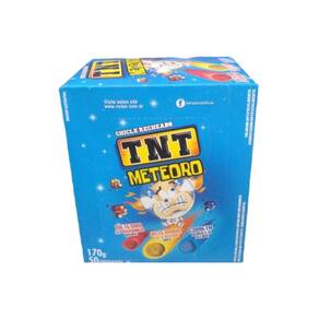 Chicle recheado TNT Meteoro 170g - 50 unidades Os Chicletes TNT são populares entre crianças e adultos, com diversos sabores e arrepiante para atender a diferentes preferências. São conhecidas por seu liquido ácido, o que as torna agradáveis de serem consumidas. Proporcionando uma opção prática para saborear um doce ao longo do dia. O chicle TNT Meteoro traz uma experiência sensorial através de sabores como "Cometa de Gelo" (gelado) , "Asteroide de Frutas" (doce) e "Meteoro de Morango" (quente). Os Chicletes TNT contém aproximadamente 50 unidades. Marca: Não Informado