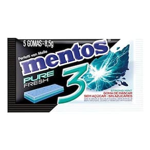 Caixa contendo 15 pacotes com chiclete Mentos 3 Camadas sabor Strong Mint com 8,5 gramas cada (5 unidades). Peso total da embalagem 127,5 gramas. SEM AÇÚCAR