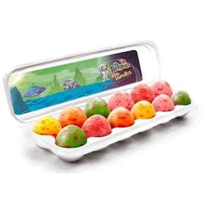 Caixa contendo 12 caixinhas com 12 unidades de chiclete em fomrato de ovinho de tartaruga cada, 25 gramas. Peso total da embalagem 300 gramas.