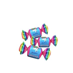 Caixa contendo aproximadamente 46 unidades de chiclete tijolinho Happy Bol sabor Hortelã com figurinhas do tema Unicórnio com 3 gramas cada. Peso total da embalagem 140 gramas.