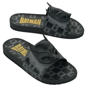 Slide com enfeite que contempla e representa o lado mais misterioso do Batman, usando como foco, sua máscara. Aplique em Full plastic para ter um toque mais macio e também possui alguns chanfros que intercalam com uma textura de nylon acetinado, brincando assim com o fosco e o polido base do material. Na sola o ícone do personagem repetidas vezes e, no centro temos a sua assinatura, deixando o calçado ainda mais divertido!