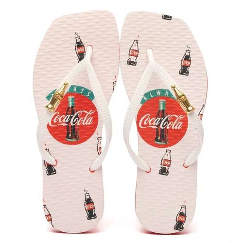 * O chinelo Coca-Cola é uma escolha perfeita para quem busca conforto e praticidade. * Cabedal em sintético emborrachado macio; * Tira com adereço da marca metalizado localizado na lateral externa; * Palmilha com estampa; * Bico redondo; * Solado emborrachado que garante segurança e estabilidade ao caminhar; * Medida do solado: 1,5cm. * Modelo super leve e estiloso, oportunizando a combinação de vários looks despojados.