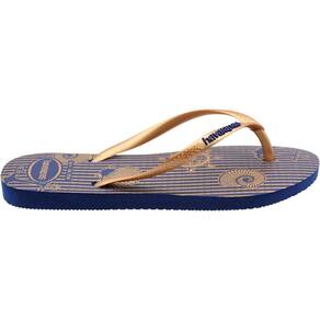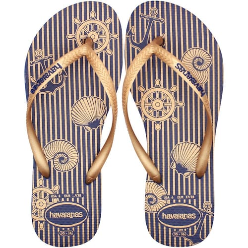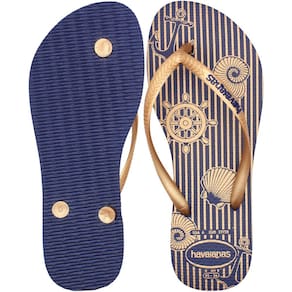 O Chinelo Havaianas Slim Nautical traz todo charme do estilo náutico, é um modelo super prático e confortável. Possui tira slim em borracha com a tradicional logomarca da Havaianas em destaque. Possui estampas clássicas do estilo navy, que ilustra listras, ancoras e animais marinhos, uma peça curinga no seu guarda-roupa. Solado de borracha com frisos antiderrapantes. Este chinelo combina com vários looks do dia a dia!