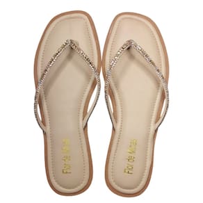 Aviso: Há divergência entre o título e as imagens fornecidas. O título menciona "Chinelo Dedo Flor de Minas Strass Metalizado PE2132/2244", mas as imagens mostram chinelos com solado quadrado, palmilha metalizada e tiras com strass, um com acabamento prateado e outro em tom nude. A descrição será gerada com base nas imagens.