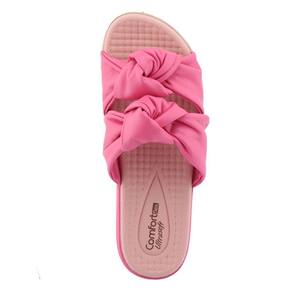 Chinelo feminino da Comfortflex 21-44404 é macio e muito confortável. Seu cabedal é fabricado em materiais sintéticos respiráveis, apresenta em duas tiras fofas no peito do pé com detalhe em nó, seu calçe é fácil, pois não possui fechamento é slip on. O Chinelo tem suas tiras forradas, sua palmilha é fixa, macia e almofadada com a logo da marca. Seu solado tem 1,5cm de altura traseiro e 1cm de altura frontal, o solado apresenta frisos para maior segurança. É um lindo modelo, ideal para o dia à dia ou passeios.