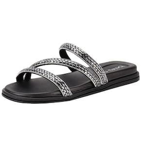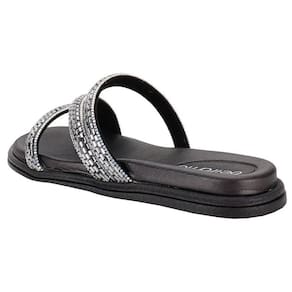 O modelo slide, caracterizado pela tira única sobre o peito do pé, oferece praticidade no calce, proporcionando um ajuste fácil e rápido. A presença do brilho adiciona um toque de glamour, elevando o visual do chinelo e tornando-o versátil o suficiente para compor tanto looks casuais quanto mais refinados.