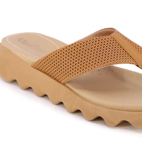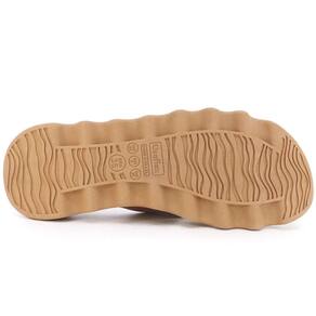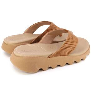Chinelo plataforma com cabedal em napa valise na cor tan. O modelo possui tecnologia Sola+Conforto, um solado com altura entre 2 e 4cm de salto que distribui o peso corporal na pisada.