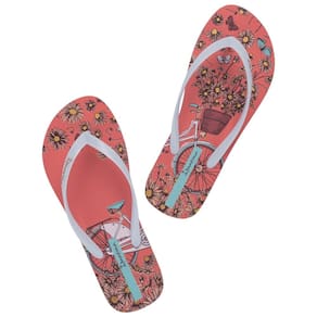 Chinelo com grafia de bicicleta, trazendo uma disposição atualizada dos elementos e mais riqueza de detalhes para a estampa. A estampa transmite alegria, delicadeza e romantismo.