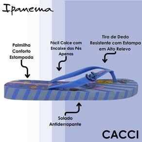 A Ipanema Disney Joy, em traduções lúdicas e delicadas, destaca os personagens no meio da palmilha rodeando-os por ícones reconhecidos, como laços e corações. Ainda conta com grafia continua na lateral da sola, além da tira translúcida com aplique em alto-relevo do personagem complementa o chinelo.