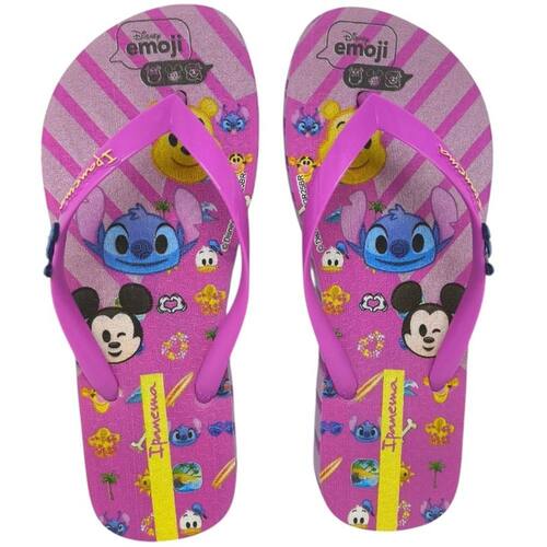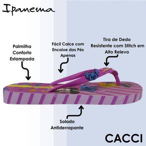 A Ipanema Disney Joy, em traduções lúdicas e delicadas, destaca os personagens no meio da palmilha rodeando-os por ícones reconhecidos, como laços e corações. Ainda conta com grafia continua na lateral da sola, além da tira translúcida com aplique em alto-relevo do personagem complementa o chinelo.