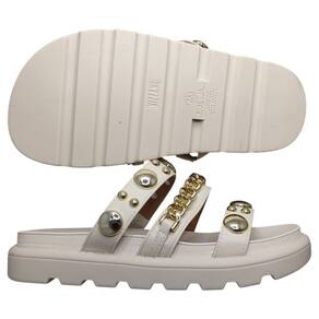 O design arrojado apresenta tachas douradas que adicionam um charme especial e um toque de sofisticação ao calçado. Com tiras largas que envolvem o pé e fechamento em fecho aderente, a papete proporciona um ajuste seguro e fácil. Ideal para combinar com looks leves e descontraídos, como shorts, vestidos e calças de linho.