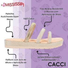 O Slide Mississipi Flatform com Brilhos chega para transformar o seu dia a dia com um toque de sofisticação e modernidade. Com um design que une praticidade e elegância, ele se destaca pelo acabamento metalizado da sola flatform e pelas tiras com aplicação de strass, garantindo um visual moderno e cheio de charme.