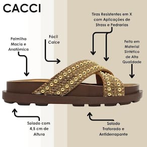 Conheça o novo chinelo Strass da Cacci, o chinelo de se apaixonar por onde for! Feito em material de alta qualidade que trás mais durabilidade ao calçado. Seu destaque é feito por suas duas tiras em X repletas de strass aplicados e pedrarias, que trás todo seu charme e atenção, além de tiras resistêntes ela se torna um chinelo fácil calce.