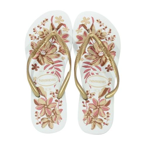 A Slim Organic é um dos chinelos mais atemporais da Havaianas. Com as tiras mais finas e solado mais leve, esse modelo tem estampa floral na sola e tiras com efeito metálico. Perfeita para um estilo romântico e sofisticado.