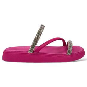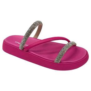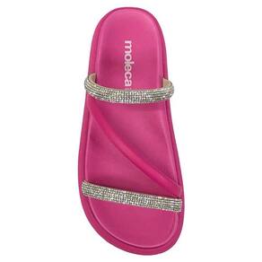 * Confeccionado em sintético;* Interior das tiras em tecido macio;* Palmilha fixa, macia e confortável em sintético;* Calce fácil;* Solado em PVC antiderrapante, com aproximadamente 3cm;* Bico redondo;* Detalhe das tiras em brilho. Ean: 7900015735658