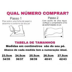 TABELA DE MEDIDA 34 - 23,5 cm 35 - 23,5 cm 36 - 24,5 cm 37 - 24,5 cm 38 - 25,5 cm 39 - 25,5 cm 40 - 26,5 cm 41 - 26,5 cm 42 - 27,5 cm 43 - 27,5 cm