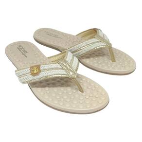 Design sofisticado: tira única de dedo resistente com detalhes de pedrarias e tranças metalizadas que acrescentam um toque de charme ao visual.