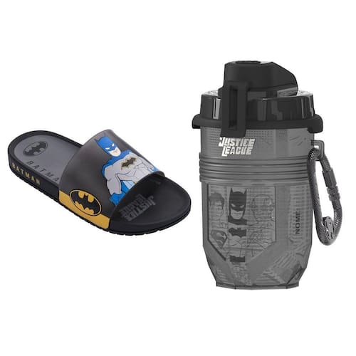 O slide Liga da Justiça Action Refresh é perfeito para os dias de verão que se aproximam! A tira transparente traz os grandes heróis em destaque: Super Homem, Batman. E para esse combo ficar perfeito, junto vem um Cantil da Liga da Justiça que tem um mosquetão super maneiro pra garantir a água do seu pequeno herói sempre por perto! Características Material interno: Sintético Material externo: Sintético Solado: Emborrachado Peso: 290 gr