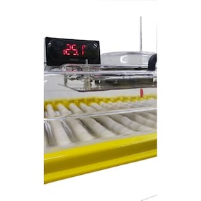 Chocadeira com controle digital de temperatura, com valores pré-determinados pelo usuário. Giro automático dos ovos. Grade de roletes universal que possibilita o uso para diferentes tamanhos de ovos simultaneamente. Circulação forçada de ar. Chocadeira indicada para iniciantes ou hobbystas. Caracteristicas: Marca: Premium Ecologica Tipo de Produto: Chocadeira Materiais: Base em PS, tampa em PETG Capacidade Ovos : Galinha 70; Pavão 38; Faisão 100; Codorna 180. Potência W : 130 W Ruido DB : Máximo de 58DB Voltagem: 127 Cor: Amarela Conteúdo da Embalagem: 1 chocadeira, 1 manual, 1 garrafa, 8 roletes, 1 termômetro, 1 tela de proteção Dimensões aproximadas do produto cm : 17Ax64Lx54C Peso líq. aproximado do produto: 6 Kg Modelo: hobby70 Ean: 7899767110526
