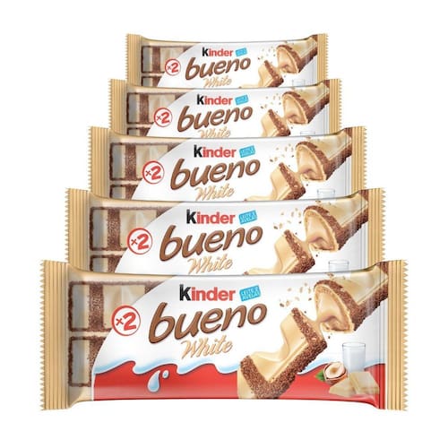 Kinder Bueno White são duas barrinhas de wafer crocantes com recheio cremoso de leite e avelãs, cobertas com uma fina camada de um delicioso chocolate branco. Embalado em porção individual, é perfeito para um lanche a qualquer momento do dia e como acompanhamento para seu café ou chá. Delicioso e prático. Peça o seu agora