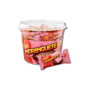 Pote contendo aproximadamente 50 unidades de bombom com recheio de morango coberto com chocolate ao leite com 9 gramas. Peso total da embalagem 450 gramas.
